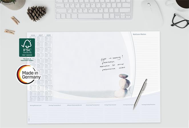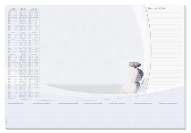 s trojročným kalendárom (2026/2027/2028) -s týždenným plánovačom -trojjazyčný: angličtina, nemčina, francúzština -veľkosť: približne A2 -odolný, protišmykový a vďaka masívnej kartónovej zadnej doske úplne rovno leží -použiteľný aj ako podložka pod myš -30 listov -farba: sivá, béžová -s certifikátom FSC