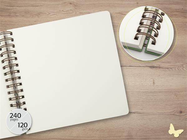 Špirálový zošit s tvrdou obálkou -matný motív - biela špirálová väzba -mikroperforované listy -240 čistých strán -120 g biely papier -vrecko na zadnej stane obalu -70% používaného materiálu s certifikátom FSC -vegánsky produkt