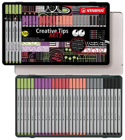 Liner, sada, v kovovej krabičke, STABILO "Creative Tips ARTY", 6 rôznych pastelových farieb, 5 rôznych hrúbok