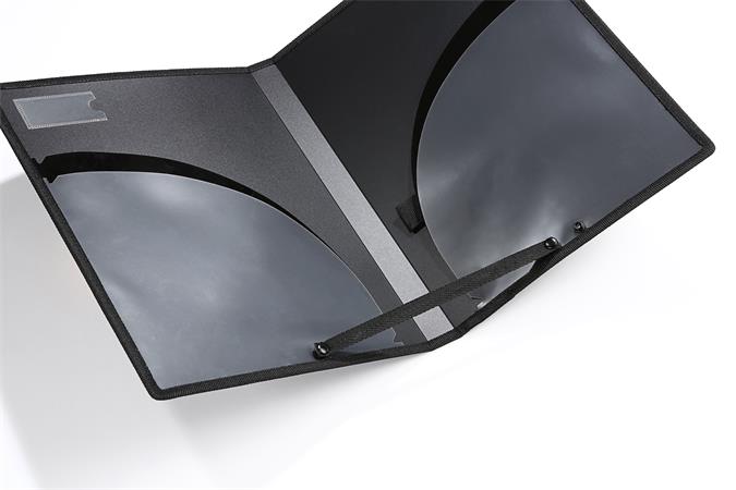 Prezentačná doska Concerto - rozmer: 24,5x34,5x2,5 cm - nastaviteľný chrbtový popruh pre pohodlné uchopenie - 2 dvojité vrecká - popruh na perá na boku - držiak na vizitky - upevňovací popruh - farba: čierna