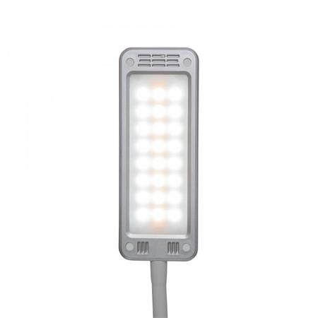 Farebnú teplotu a jas je možné nastaviť v 3 úrovniach v závislosti od dennej doby a potrieb. Dostatočne osvetlí priestor so silnou potrebou svetla, je extra ekonomický, s o 80 % nižšou spotrebou energie v porovnaní s klasickými žiarovkami. Priestorovo nenáročná, ľahko použiteľná, stabilná plastová podošva je vybavená záťažovou vložkou, ktorá slúži ako záťaž. Kovové rameno má pogumovaný povrch, plastovú hlavu svietidla je možné otáčať a nakláňať. Bezpečný a ekologický, recyklovateľný obal. - svetelný zdroj: vstavaný LED panel, s 24 LED diódami (8 teplých bielych a 16 denných bielych) - LED žiarovky nie je možné vymeniť v tele svietidla - priemerná spotreba energie: 6 kWh/1000 h - intenzita svetla: 320 lumenov - teplota farby: nastaviteľná (3 000 K , 5 000 K, 6 500 K) - priemerná životnosť LED: 20 000 hodín - s flexibilným, nastaviteľným ramenom - dĺžka ramena: 35,5 cm - priemerná pracovná výška: cca 36-38 cm - veľkosť hlavy: 16 x 6 cm - veľkosť podrážky: 16,5 x 10,6 cm - hmotnosť: 685 g - funguje zo siete 220/240 V - dotykový spínač - farba: strieborná - záruka: 2 roky - hodnotenie energetickej účinnosti: D (na stupnici A-G)