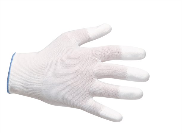kvalitné rukavice vyvinuté pre mikroelektronický priemysel, zabezpečujú pevný a bezpečný úchyt, konce prstov máčané v polyuretáne, s pružnou manžetou, materiál: nylon, polyuretán, farba: biela