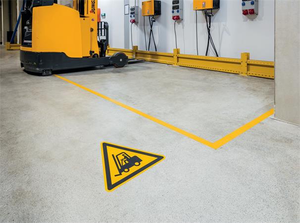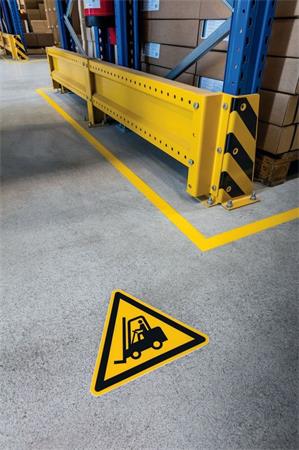 Použitie: samolepiaca bezpečnostná značka pre vnútorné podlahové povrchy, určená na označenie nebezpečných oblastí, napríklad v skladoch, distribučných centrách a výrobných závodoch