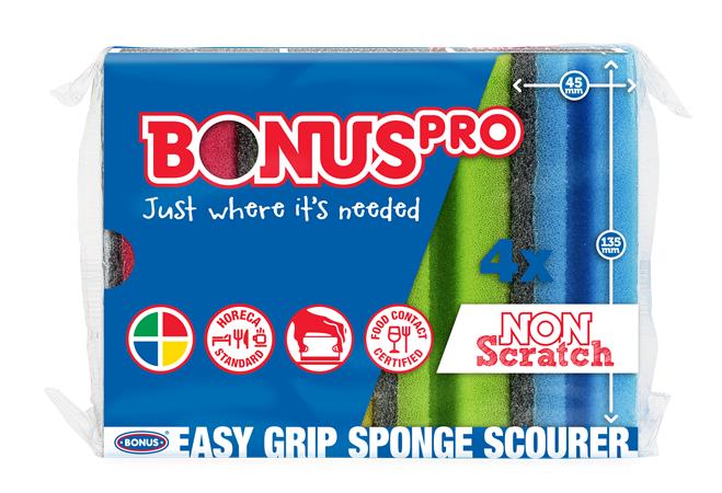 Tvarovaná špongia špeciálne prispôsobená požiadavkám segmentu HoReCa. Farebne kódovaný čistiaci prostriedok podľa HACCP predpisov pre profesionálne čistenie. Zodpovedá FCC (Food Contact Certified) certifikátu, a preto je ideálnou voľbou pre profesionálnych používateľov – reštaurácie, hotely, cateringové služby, nemocnice, verejné inštitúcie. So sivou abrazívnou vrstvou umožňuje bez poškriabania odstrániť aj suché, aj už navlhčené nečistoty. Trvácna, extra veľká (135x71x45 mm). 4 ks/bal