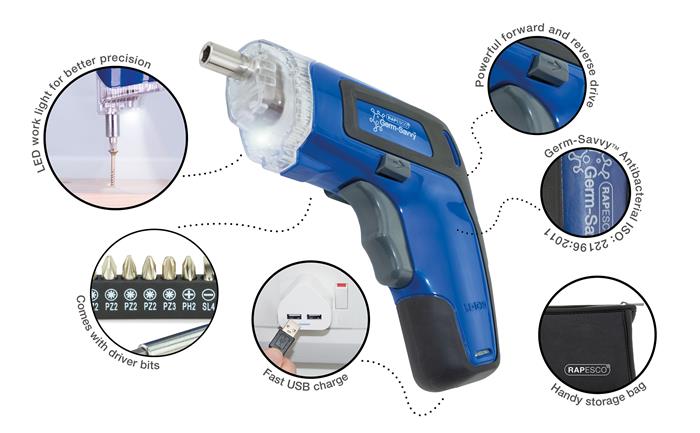Aku skrutkovač, bezdrôtový, antibakteriálny, RAPESCO, modrá