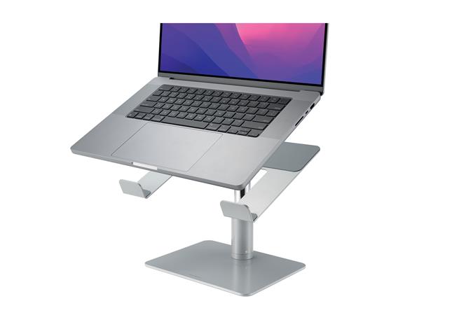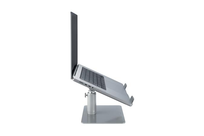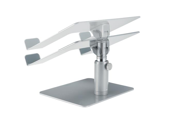 Univerzálny stolný stojan na notebook vám umožní umiestniť váš laptop do pohodlnej výšky a zároveň znížiť neporiadok na pracovnej ploche. - -pevná konštrukcia: vyrobená zo silnej ocele a hliníka -ergonomická: umožňuje používateľom zdvihnúť obrazovku do úrovne očí pre optimálny uhol pohľadu -poskytuje variabilné nastavenie výšky/sklonu pre optimálne držanie tela. (výška medzi 15 - 20 cm, uhol sklonu je možné nastaviť medzi 0°-45°) -otvorený ventilačný dizajn: podporuje cirkuláciu vzduchu, zlepšuje výkon notebooku a výdrž batérie -Under-Base Storage: poskytuje priestor na uloženie externých periférií v organizované pre pracovné prostredie - protišmykové silikónové podložky: chránia notebook pred poškriabaním a udržujú zariadenie na mieste pri práci. Bezpečnostná lišta zabraňuje skĺznutiu zariadení - max. Pre 16" notebook - nosnosť: max. 8 kg