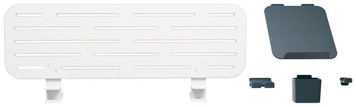 Súčasťou sú štyri doplnky na stôl, všetky vyrobené z 85 % z recyklovaného plastu: 1× držiak na notebook (vhodný aj pre MacBooky), 1× držiak na smartfón, 1× držiak na pero a 1× háčik na zavesenie slúchadiel