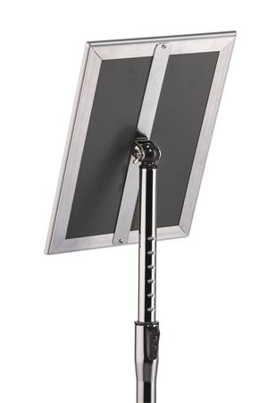 Rýchlo zostaviteľný informačný stojan so stabilným hliníkovým rámom DIN A4, v striebornej farbe - pre väčšiu stabilitu možno základňu voliteľne vyplniť pieskom. Piesková plnička nie je súčasťou balenia -okrúhly podstavec s gumeným krúžkom, ktorý zabraňuje poškriabaniu podlahy -postupne nastaviteľná teleskopická tyč, výškovo nastaviteľná od 770 mm do 1205 mm. Maximálna výška je vo formáte na výšku. - rám je možné jednoducho previesť na formát na výšku alebo na šírku. -nastaviteľný uhol čítania vďaka guľovému kĺbu. -nereflexná fólia odolná voči UV žiareniu -odolný proti rozbitiu, polystyrénový zadný panel -s profilom na pokos -ideálny v pohostinstve, maloobchode, múzeách, výstavách, veľtrhoch, recepciách, čakárňach a konferenčných miestnostiach atď.